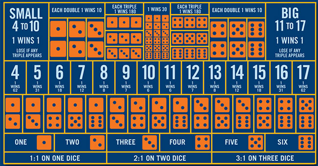 对大或小下注的区域分别在桌面的左右两角上。玩家可以对三个骰子点数总和是4-10点(小)或者11-17点(大)进行下注。